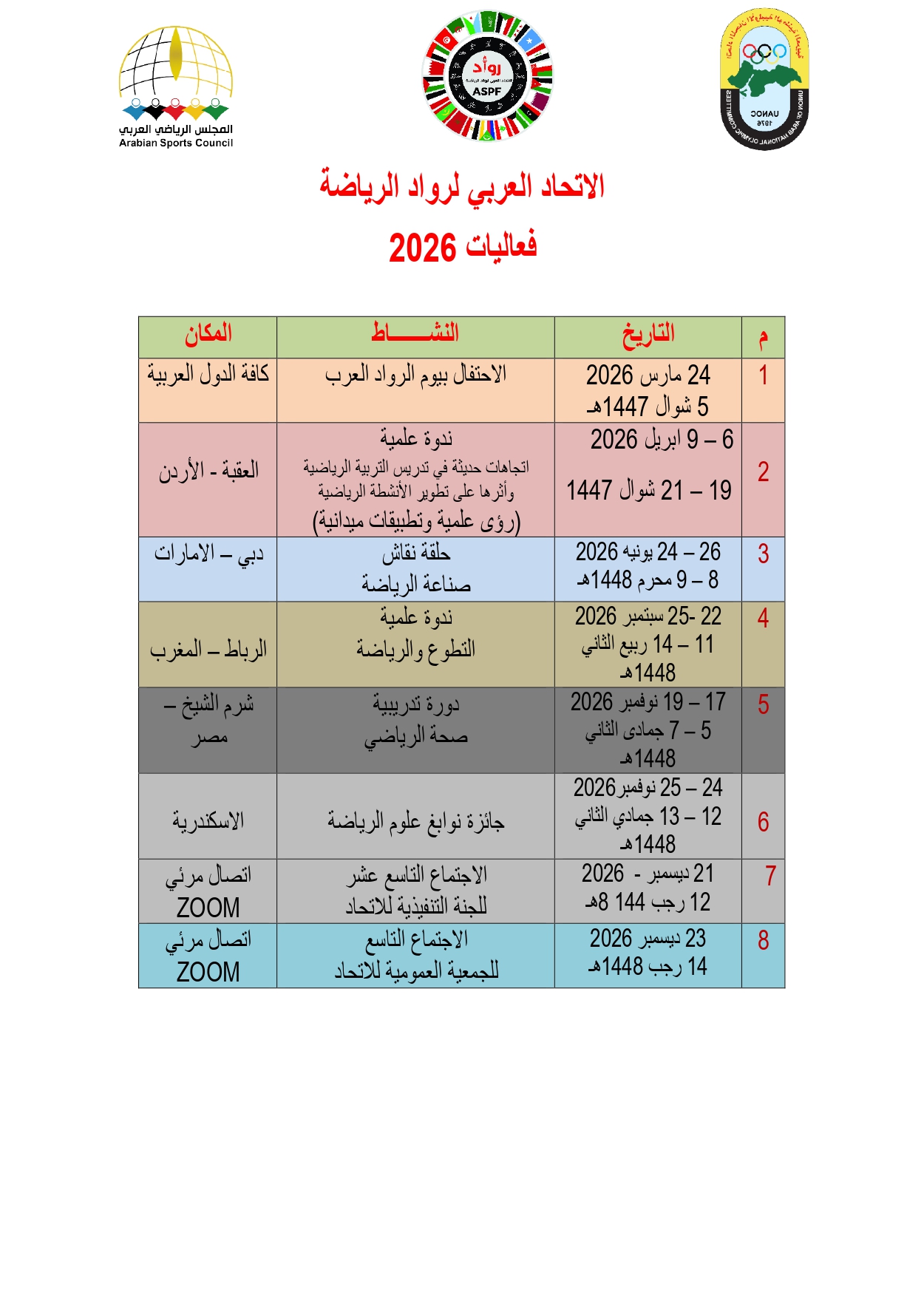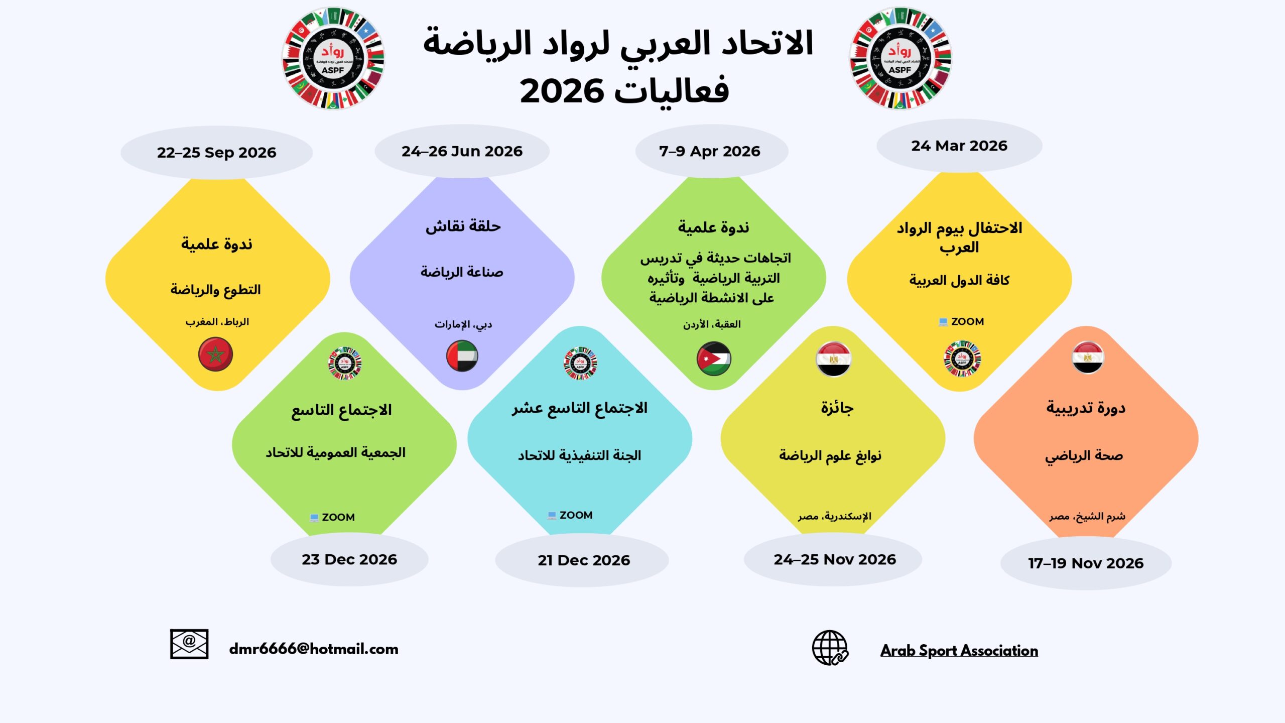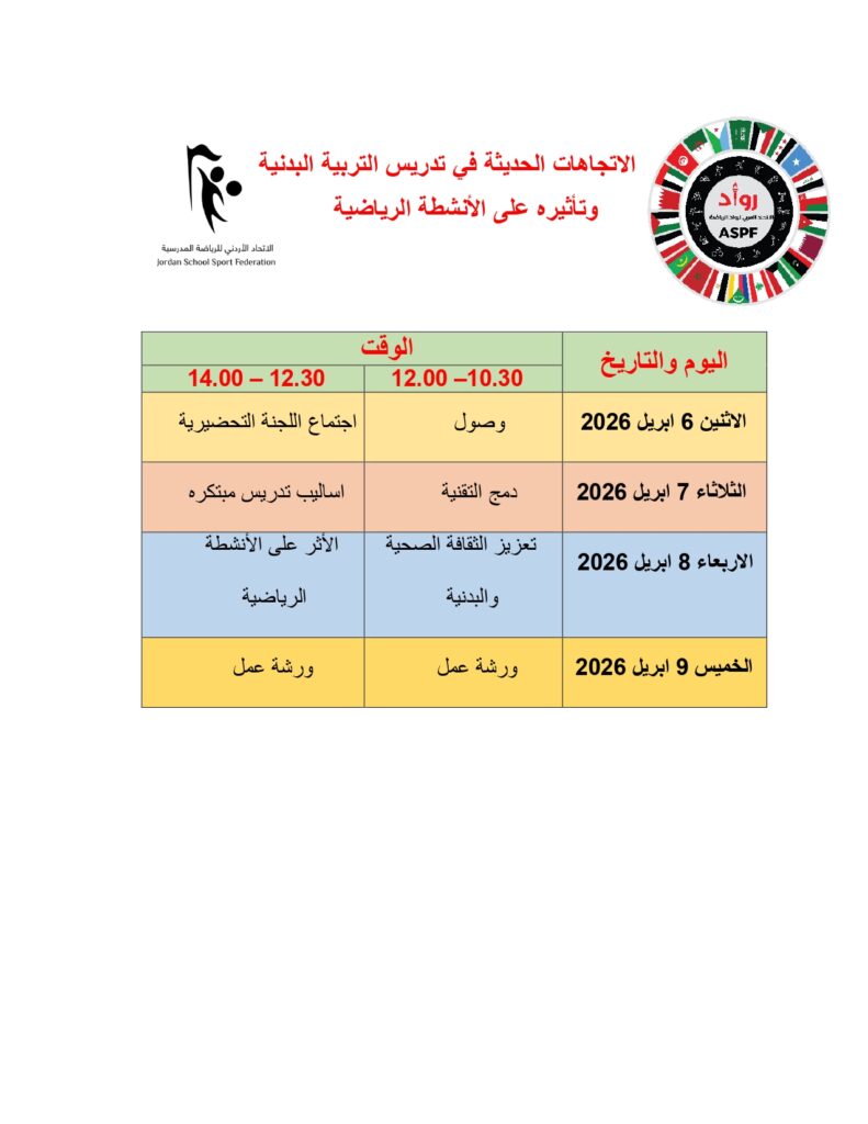 أصدرت اللجنة المنظمة للبطولة العربية المدرسية والتي ستقام في العاصمة الأردنية خلال شهر اغسطس القادم إن شاء الله تحت رعاية صاحب السمو الأمير فيصل بن الحسين،النشرة الاولى للبطولة والتي احتوت على أهداف البطولة ونوع وعدد مسابقاتها والجدير بالذكر أن اتحاد الرواد سينظم حلقه تثقيفية عن استخدامات تطبيقات الذكاء الاصطناعي في الرياضة المدرسية للسيدات والسادة المشاركين في البطولة